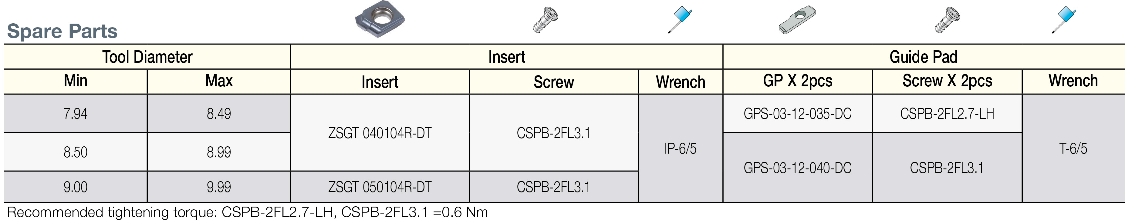 特徴 | Gundrills carrying the ZSGT indexable inserts, with single chip splitting cutting edge and a wiper for high hole surface quality. The drills are available in 35, 40 and 45 drilling length to diameter ratios. | 原産国 | Japan |
